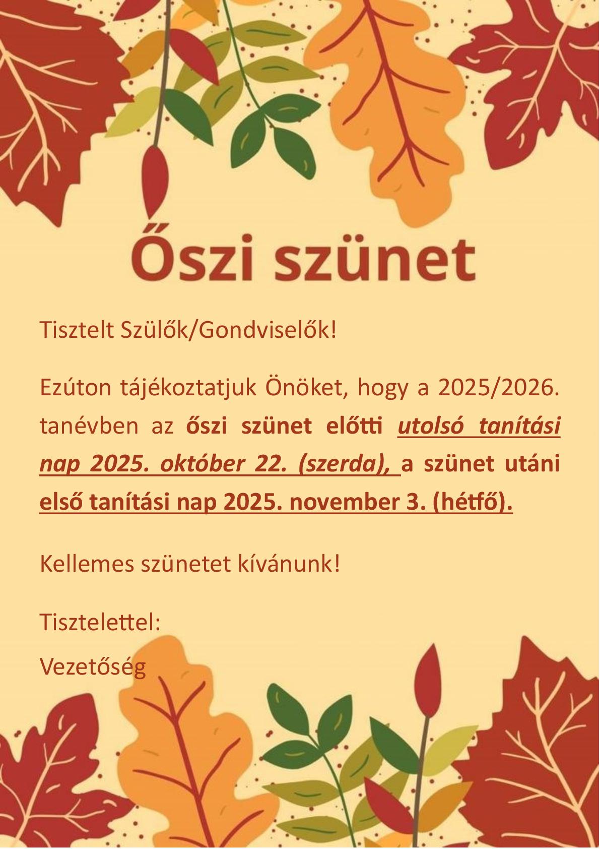 Az őszi szünet utáni első tanítási nap 2021. november 2. (kedd). A szünetre kellemes pihenést kívánunk!
