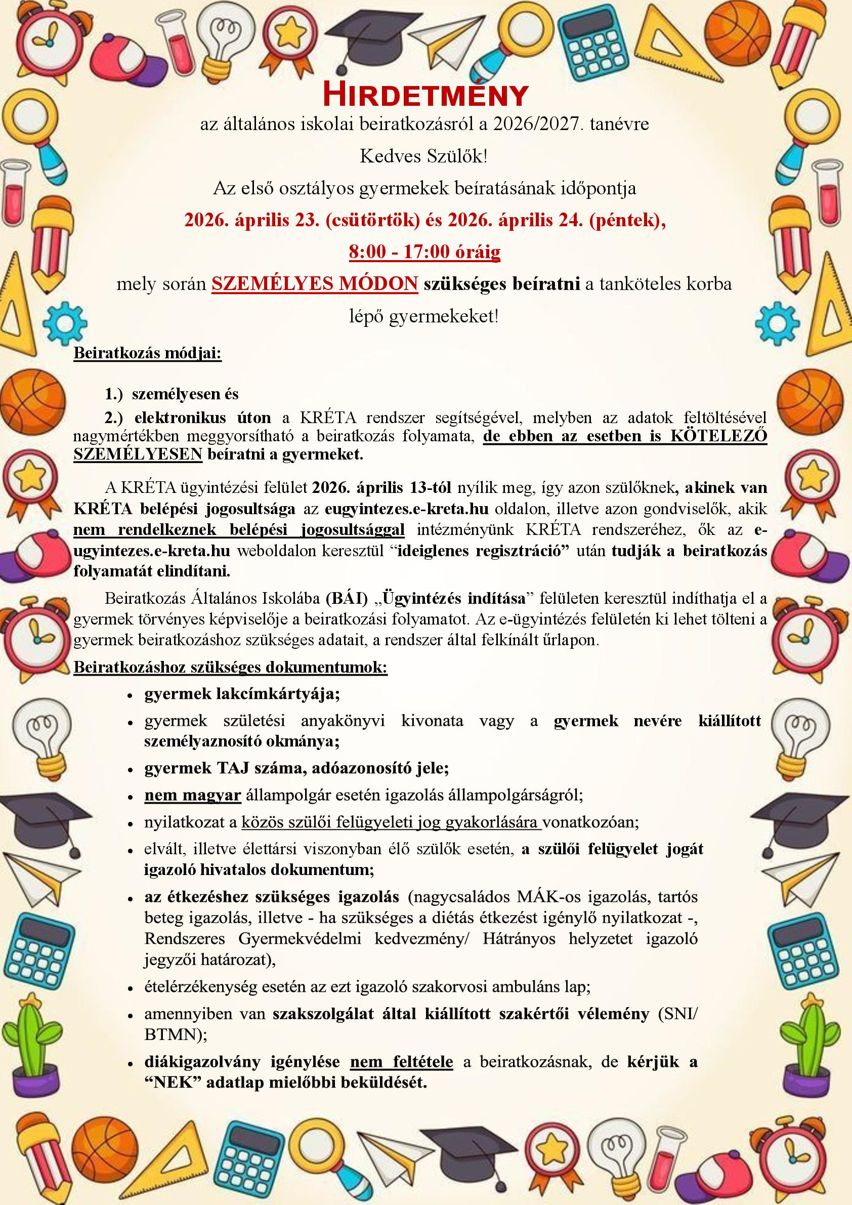 A gördülékeny ügyintézés lebonyolítása miatt kérjük, hogy akik a személyes beiratkozást megelőzően a KRÉTA felületen beíratják gyermeküket, lehetőség szerint papíralapon nyomtassák ki, és aláírva hozzák magukkal a kitöltött adatlapokat, melyre feltétlenül jegyezzék fel az adott gyermek TAJ számát és adóazonosító jelét. Ha ezen lehetőség nem áll rendelkezésükre, akkor egy külső adathordozón (pendrive-on) hozzák magukkal a kért dokumentum elektronikus változatát.